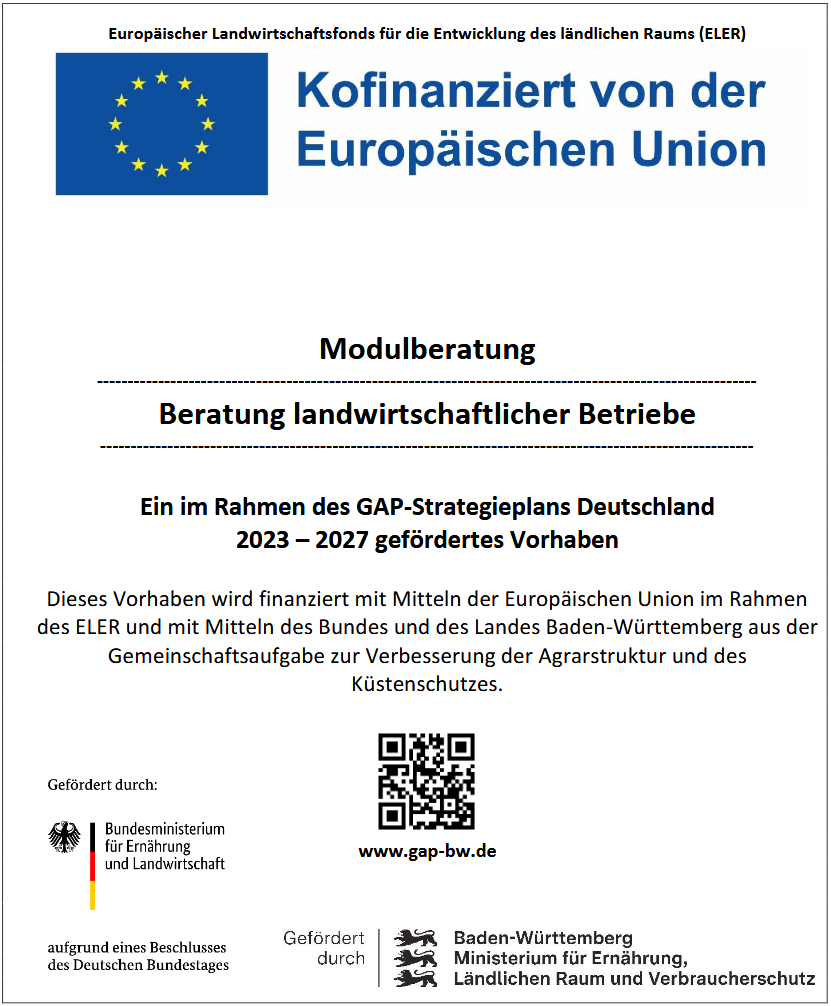 Seit 2015 sind wir als Beratungsorganisation im Rahmen des Maßnahmen- und Entwicklungsplans Ländlicher Raum Baden-Württemberg zertifiziert und bieten geförderte Betriebsberatung an.